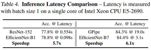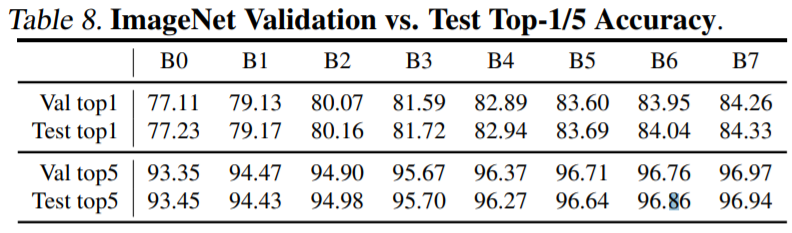 비슷한 accuracy를 가진 model과 비교할 때 적은 parameters와 FLOPs를 갖는 것으로 나타난다. 특히 EfficientNetB7은 논문이 제시되었을 당시 state-of-the-art였던 GPipe의 performance를 능가한다. 표에서 볼 수 있는 것과 같이 accuracy와 efficiency 모든 부분에서 좋은 결과를 나타내는 EfficientNet은 여러 competition에서 가장 인기 있는 classification model이다. backbone으로 매우 훌륭한 장점을 지니고 있기 때문에, EfficientNet을 사용한다면 다양한 task에서 좋은 결과를 얻을 수 있다.