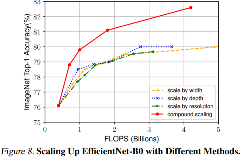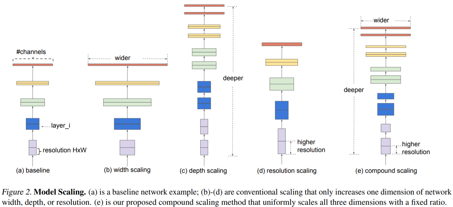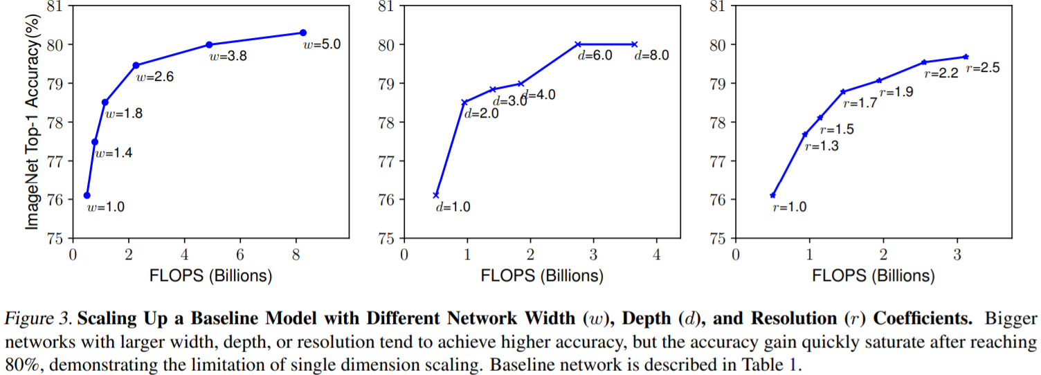 EfficientNet[4]은 compound coefficient를 사용하여, depth, width, resolution를 균일하게 확장하여 보다 적은 parameter로 높은 accuracy를 얻는 방법을 제안한다. 이전의 이론적 [1][2] 및 경험적 [3] 결과는 모두 network width와 depth 사이에 특정 관계가 있음을 보여준다. [4] 보다 높은 accuracy와 efficiency를 위해서는 depth, width, resolution의 균형을 맞추는 것이 중요하다. 직관적으로 생각해보면, image resolution이 커지면, receptive field를 변경하고, fine-grained pattern을 잘 capture 하기 위해 width가 증가해야 한다.