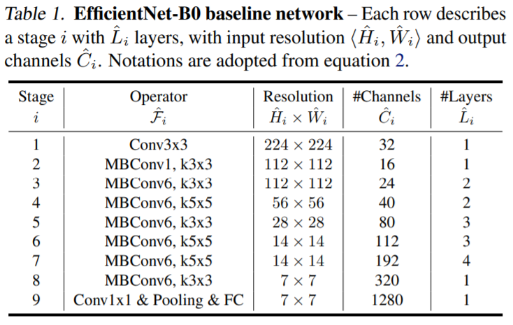 EfficientNet의 scale up 방법은 ResNet이나 MobileNet 등 다양한 architecture에 적용할 수 있다. 다만, 기본적으로 성능이 낮은 network를 사용하면 scale up을 하더라도 임계 성능이 낮을 수 있다. EfficientNet 팀은 neural architecture search를 사용해 MNasNet과 유사한 새로운 baseline network [4]를 개발한다.