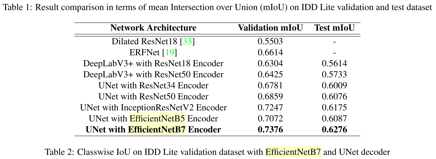 semantic segmentation task를 위해 다양한 architecture를 구현한 결과가 table 1에 요약되어 있다. table 1에서 UNet decoder가 DeepLabV3+[6] decoder보다 성능이 더 우수한 결과가 나타난다. UNet [7]의 encoder에서 low level feature이 더 많이 포함되었기 때문에 multiple object와 dense object가 있는 복잡한 장면을 분석하는데 유용하다. EfficientNetB7 model은 image classification을 위해 다른 architecture보다 성능이 뛰어나다.