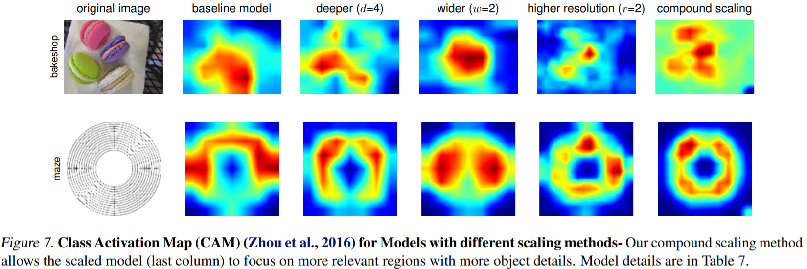 class activation map은 compound scaling의 우수성을 입증한다. compound scaling을 사용한 model은 더 관련성 있는 영역에 초점을 맞추는 반면, 다른 model은 detail이 부족하거나, 일부 object만 capture 한다.