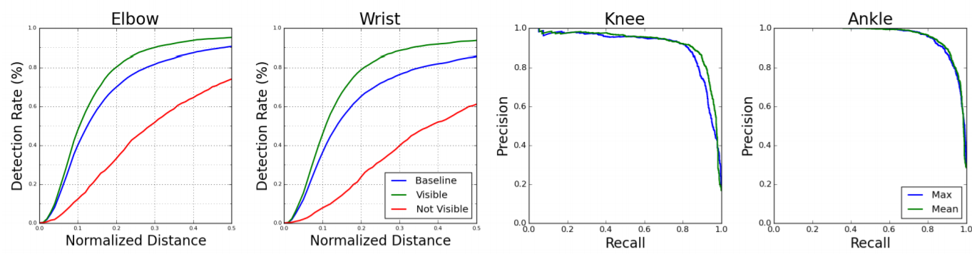 pose estimation에서 multiple people이 나타난 때 제한된 성능이 나타난다. 서로 매우 가까이 있거나 겹치는 경우 모호한 상황일 때 나타나는 occlusion 문제 때문이다. 이미지 관절이 보이지 않지만, 실제로 존재하는 경우나, 몸의 일부만 보이는 image에서 pose estimation을 할 때 상당한 난관을 겪을 수 있다. 무조건 관절을 그려야 한다면, 무의미한 예측을 하게 되는 경우가 있다. 반면에 heatmap은 관절의 존재 여부를 판단해 필터링할 수 있다. Fig11에서 not visible의 detection rate가 상당히 낮은데, 이와 같은 상황을 필터링하면 비교적 정확한 pose를 estimation할 수 있을 것이다. 현실 세계의 다양한 문제에서 occlusion이 많이 발생한다는 부분을 고려할 때 heatmap을 사용하는 stacked hourglass network가 더욱 가치 있을 수 있다.