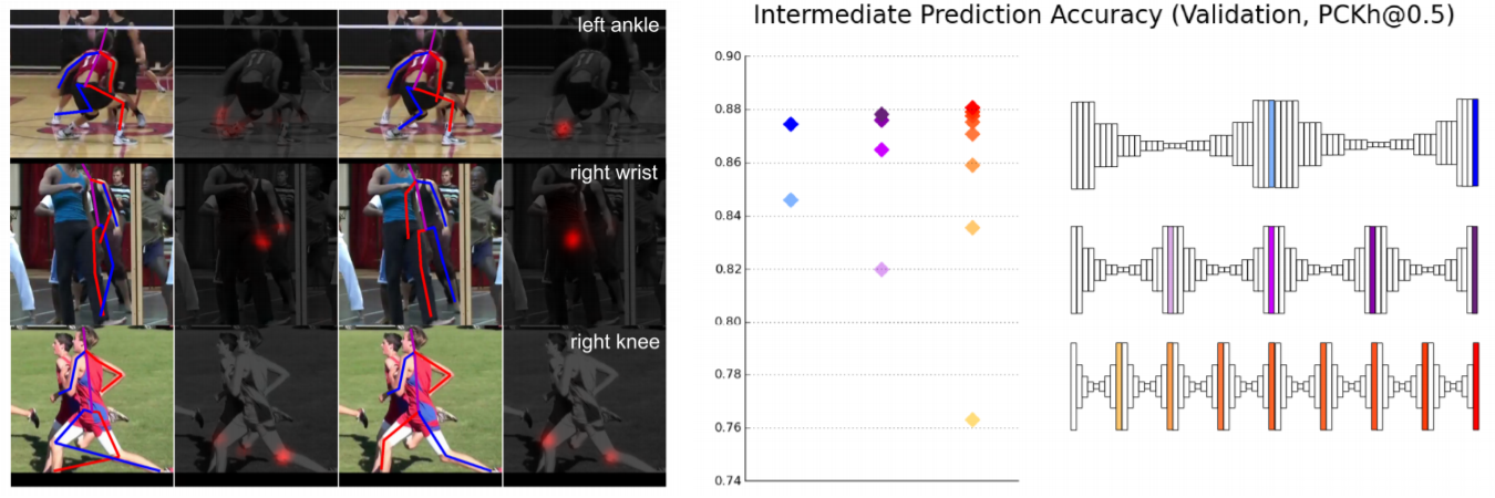 intermediate prediction의 결과가 fig 9에 나타난다. fig 9의 좌측 이미지에서 좌측은 second hourglass의 intermediate stage와 eight hourglass의 final prediction의 비교 결과다. 해당 이미지에서 확인할 수 있듯이 intermediate stage의 결과가 부정확하지만 final prediction에서는 보정된다. 이처럼 각 hourglass를 통과하면서 pose estimation의 성능은 향상하는 것을 우측 이미지에서 확인할 수 있다. 해당 이미지에서는 hourglass의 개수에 따라 3가지 network로 나눴는데 모든 network의 parameters는 같다. 결과에서 볼 수 있듯이 단순히 hourglass를 쌓을수록 final prediction의 결과가 더 높아진다.