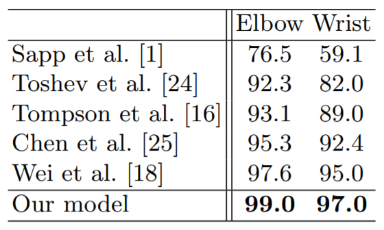 평가는 percentage of correct key points metric을 사용해서 수행한다. 결과는 다른 architecture보다 우수하다. 성능은 일반적으로 2~3% 가량 향상되는데 특히 knee와 같이 어려운 부분에 대한 성능 향상 폭은 보다 크게 증가한다. stacked hourglass network는 단순히 구조를 쌓고 intermediate supervision을 적용함으로써 큰 성능 향상을 얻는데, 이 network를 기초로 향후 개선된 architecture를 생성해 sota의 성능을 달성하는 경우도 여럿 존재한다.